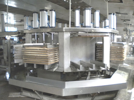 全自動(dòng)旋轉(zhuǎn)式腐乳坯及豆干壓榨成型機(jī),將完成凝固的豆腦包及托板用傳送機(jī)自動(dòng)傳送到壓榨機(jī)前...